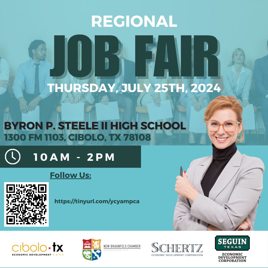 The Greater New Braunfels Chamber of Commerce, Cibolo Economic Development Corporation, Seguin Economic Development Corporation, and Schertz Economic Development Corporation are proud to announce their collaborative effort in hosting the third Regional Job Fair of 2024. This highly anticipated event is scheduled to take place on Thursday, July 25th, 2024, from 10:00 AM-2:00 PM, at Byron P Steele II High School 1300 FM 1003, Cibolo, TX 78108 and will feature over 60 employers from the cities of Cibolo, New Braunfels, Schertz, and Seguin.