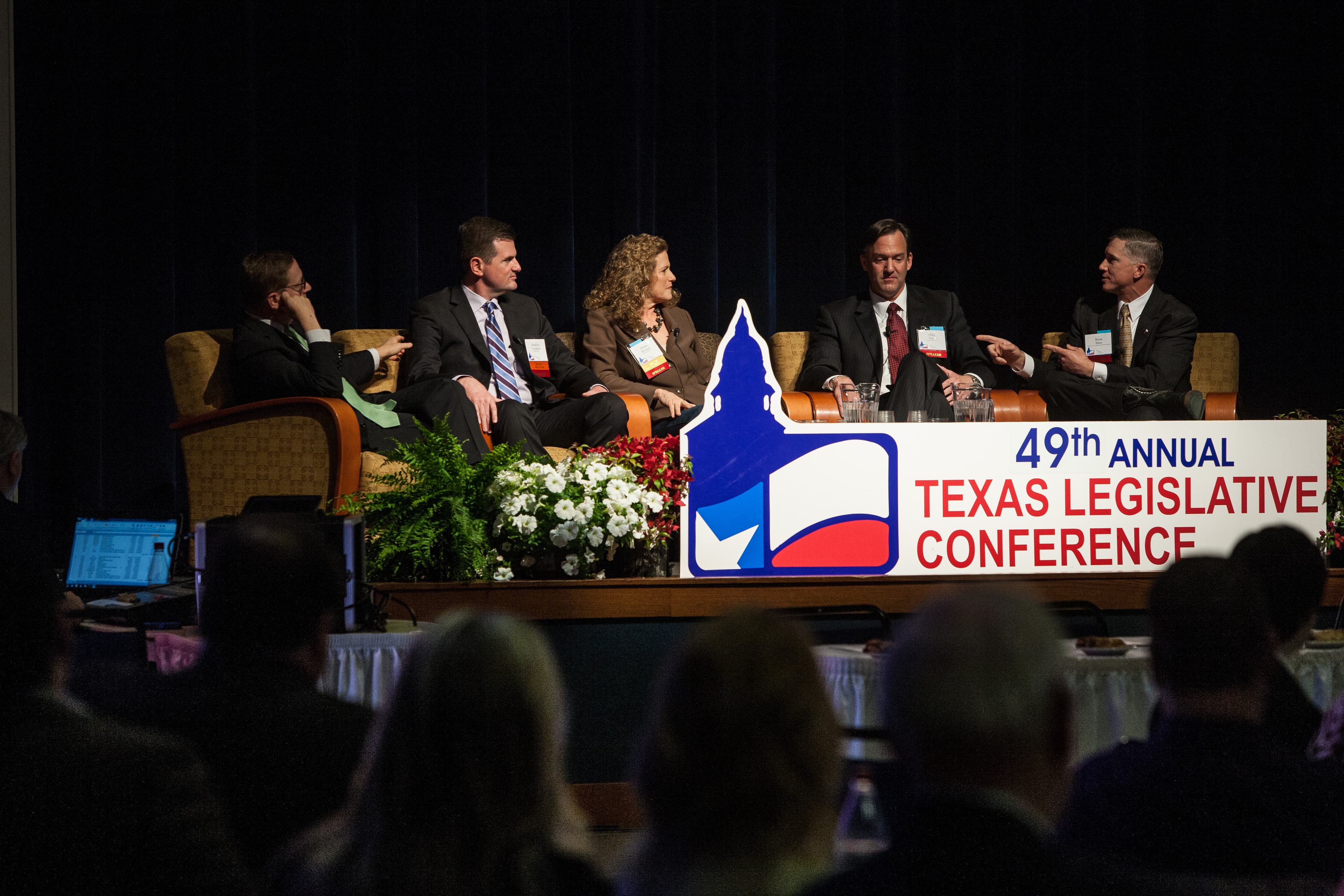 A panel on Federal Intervention & Texas Infrastructure from the 2015 Texas Legislative Conference. Pictured (left to right): Evan Smith of the Texas Tribune, State Senator Brandon Creighton, State Representative Donna Howard, Mike Nasi of Jackson Walker, LLP, and TCEQ Chairman Bryan Shaw.