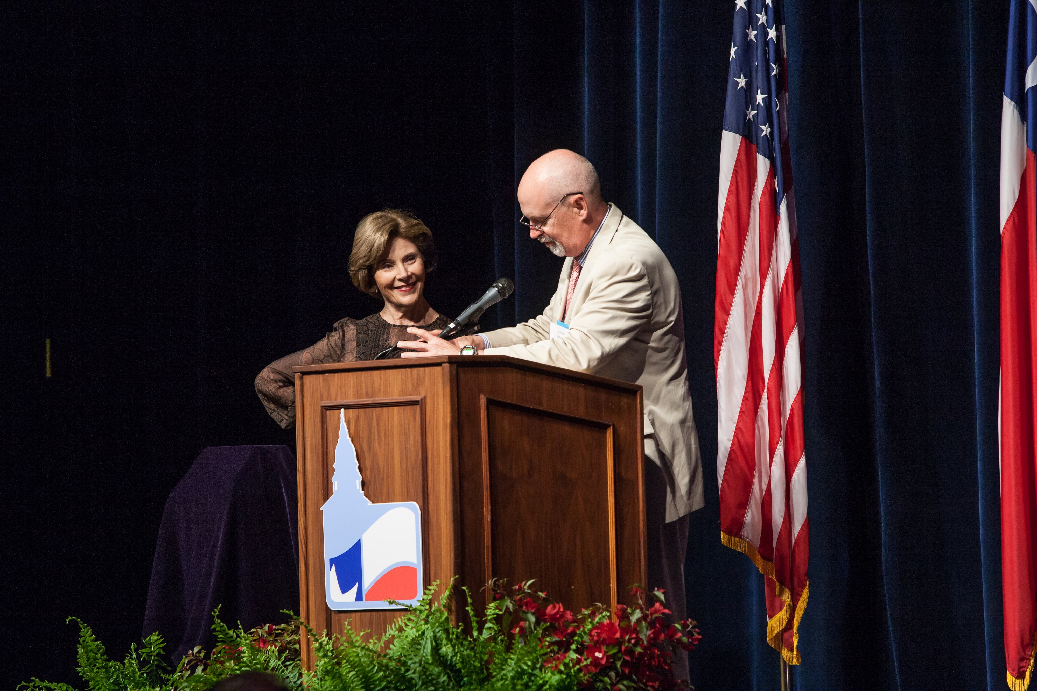 In 2015, First Lady Laura Bush accepted her Texan of the Year Award from 2005. Ten years earlier when she was named the Texan of the Year, she was scheduled to attend the Conference to accept the award, however, Pope John Paul II passed away five days prior to the Conference. She missed the Conference to attend his funeral but was able to accept her award in 2015.